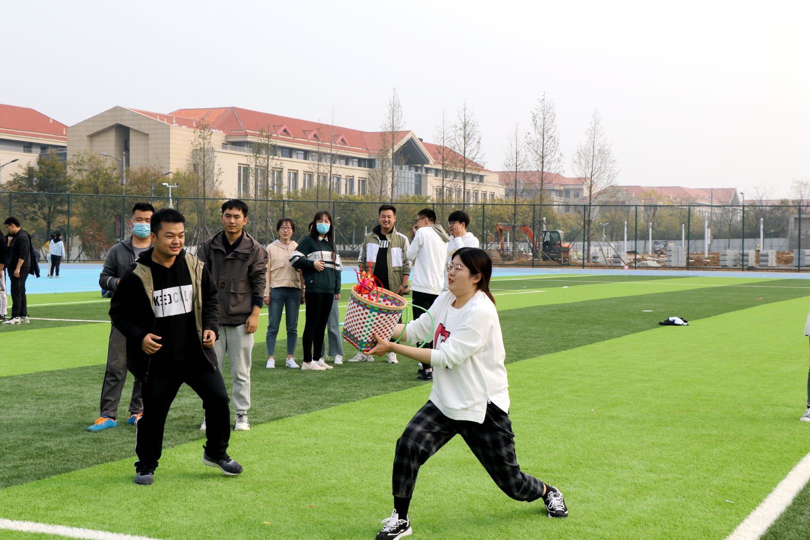 秋风起,抛绣球,你投我接好兆头。抛绣球作为本次接力赛的第一个项目,一开始就吸引了大家的眼球。在运动场上,同学们相互配合,抛球者用力将绣球抛向空中,形成一道道完美的抛物线,手持竹筐的队友灵活地移动,努力接住迎面而来的绣球。赛场上精彩纷呈,欢呼与喝彩声不绝于耳。