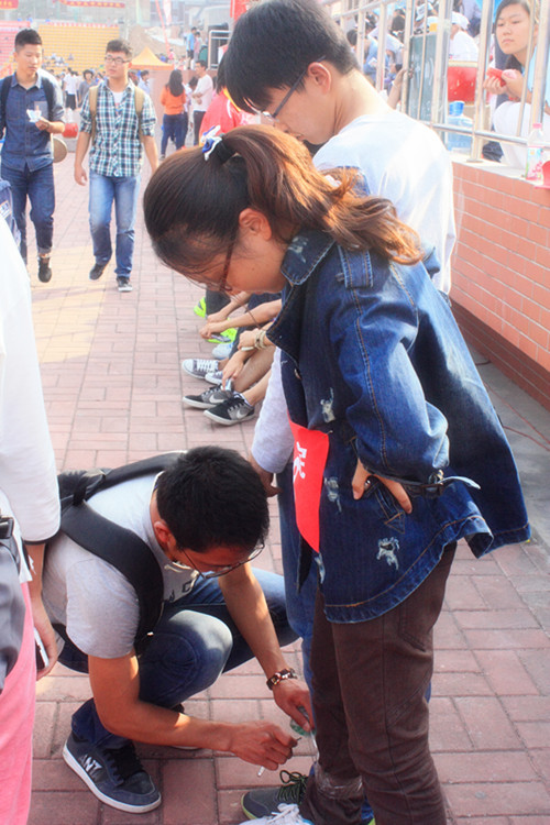 两人三足考验的是配合与默契,大家都认真准备着,
