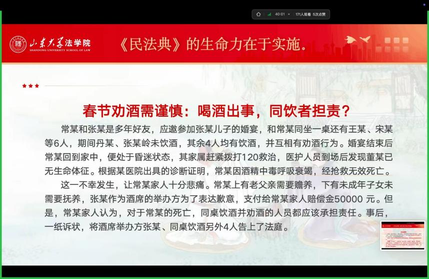 范艳华首先以一段生活化的普法视频引入本次宣讲主题,随后依次介绍了民法典的编纂背景、性质定义、章节构成和颁布的意义。时值农历乙巳蛇年来临之际,范艳华结合案例,详细介绍了常回家看看——子女对父母赡养义务、春节压岁钱——赠予合同、聚餐劝酒——劝酒者、同饮者责任义务等与节日活动息息相关的实用民法知识,让法治守护祥和春节。在宣讲最后的问答环节,参会同学对宣讲知识进行回顾,加深理解。