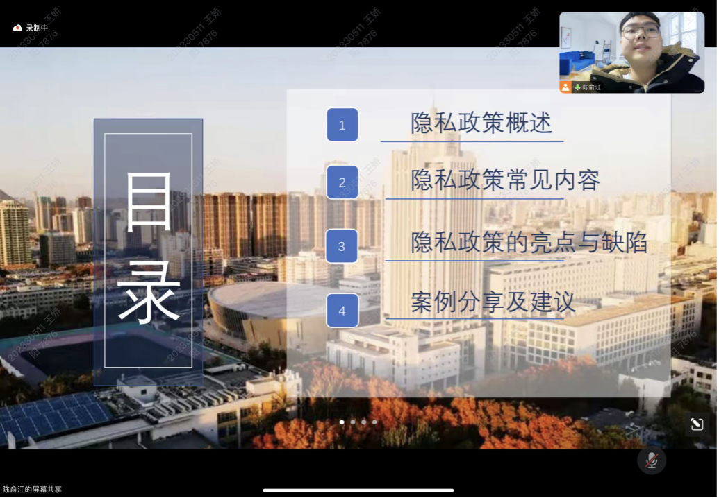 2月14日,聚焦大学生个人信息保护的《电商平台隐私政策解读》线上宣讲会借助腾讯会议平台顺利举行。本次宣讲会由taptap点点体育“网安共治”赴即墨区关于电商平台个人信息保护调研团成员陈俞江主讲,吸引了四十余位高校学生参与。