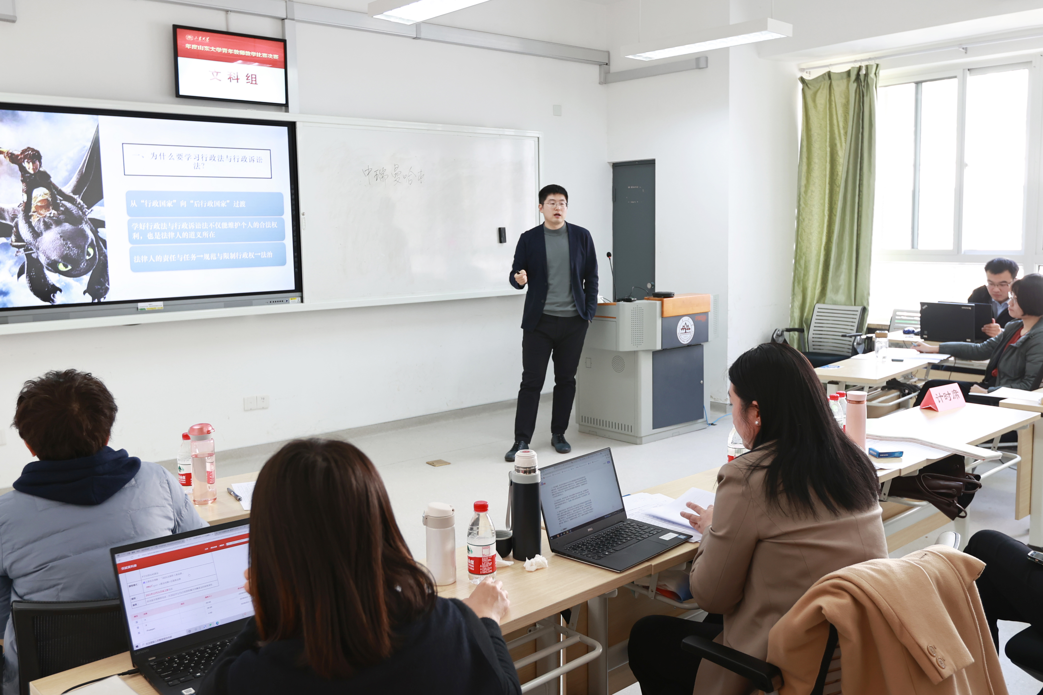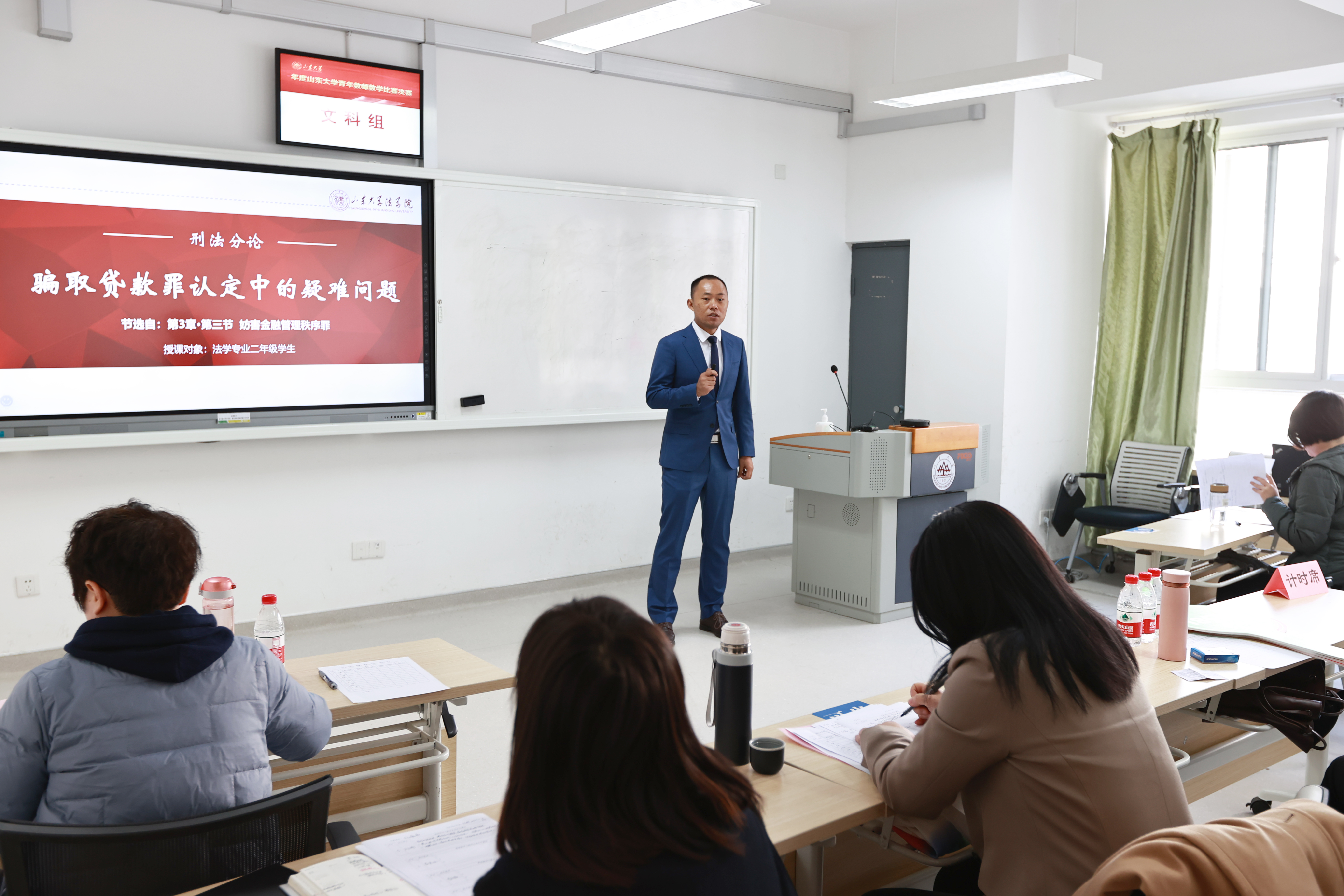 李本灿教授针对法学专业二年级的学生,主要讲授了骗取贷款罪认定中的疑难问题。他以贷款行为中的几个典型问题为切入点,引出了学习的内容和目标。随后围绕三大核心问题,李本灿教授对学生认识骗取贷款罪的构造进行了详细的阐释。傅爱竹博士在决赛中抽签抽到了“为什么要学习行政法与行政诉讼法”一节,通过揭示这门课与学生个人生活的密切关联,以及法律人在行政国家的时代背景下所应肩负的道义与责任,有效地激发了学生学习这门课的兴趣与内在动力。傅爱竹博士以贴近生活的事例、图文并茂的ppt以及轻松幽默的语言,不仅深入浅出了阐明的课程的主旨与意义,也打动了现场的评委老师。两位老师的讲授获得了评委的一致好评,并最终荣获二等奖。