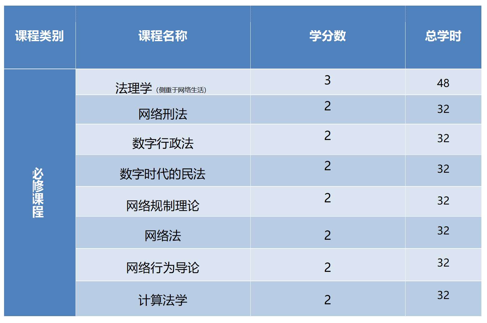 微专业共计17学分,其中法学基础课程9学分,包括法理学(侧重于网络生活)、网络刑法、数字时代的民法、数字行政法;网络安全类课程8学分,包括网络规制理论、网络法、网络行为导论、计算法学。