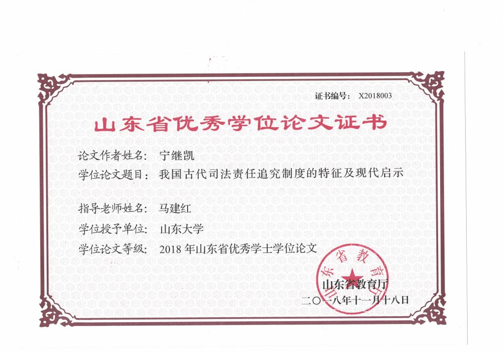 经学院推荐,学校专家组审阅和评选,我院2017届毕业生宁继凯同学的本科毕业论文获 “2018年山东省优秀学士学位论文”,学位论文题目为《我国古代司法责任追究制度的特征及现代启示》,指导教师为马建红副教授。特向宁继凯同学和马建红副教授表示祝贺!