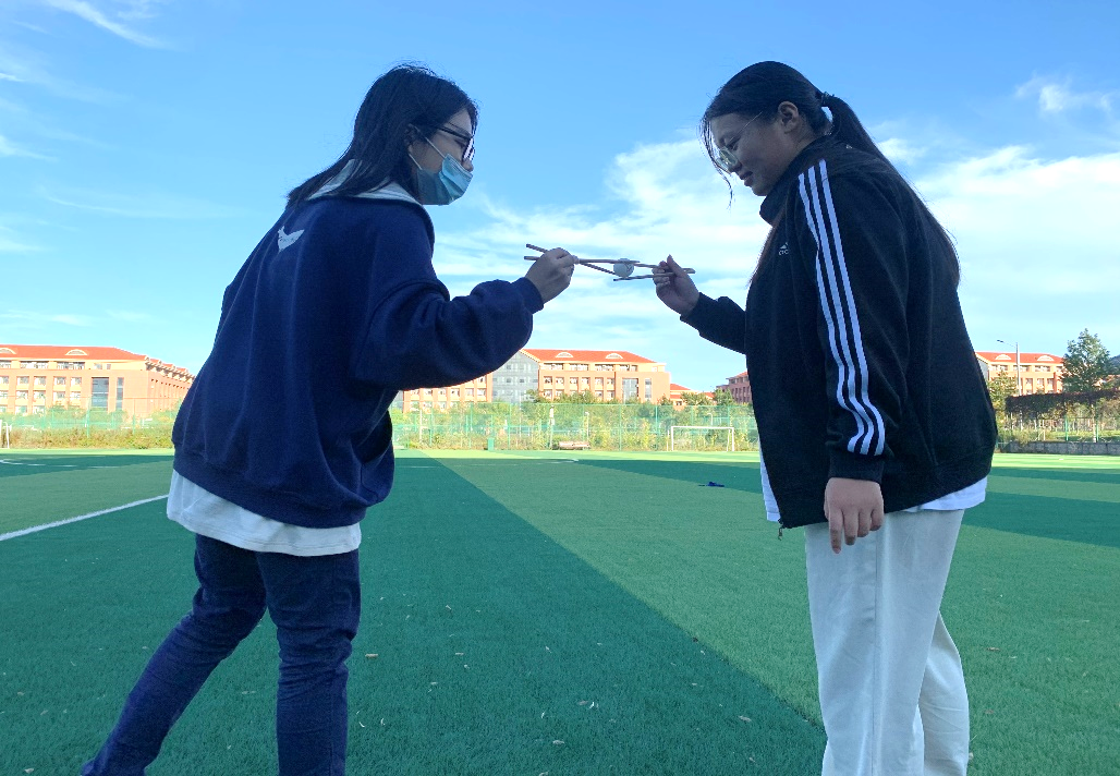 乒乓球接力看似简单,但从夹起到入筐,“危险”无处不在。同学们在往返夹球的途中飞速奔跑,又在接力时回归冷静,以合适的力道将自己夹住的球送到同伴手中,体现了3班同学张弛有度,团结一致的作风。反手扔沙包项目主要考验2人的协调配合能力。当一个个沙包在空中划出迷人的抛物线,伴随着“沙沙”的声音进入小桶,同学们脸上洋溢的无不是胜利的喜悦。