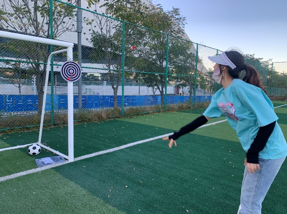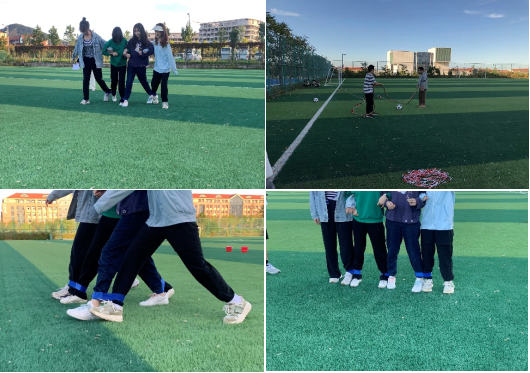 掷飞镖比赛中, 参赛选手们严格听从裁判员的安排,在规定的黄线外笔直站定, 参赛的选手屏气凝神,对准靶心,手腕一转,飞镖犹如离弦之箭飞了出去,“握镖——瞄准——投标”三个动作一气呵成。在声声欢呼中,同学们一次次超越自我,享受着户外运动的快乐。四人五足游戏则体现出同学们的集体凝聚力,