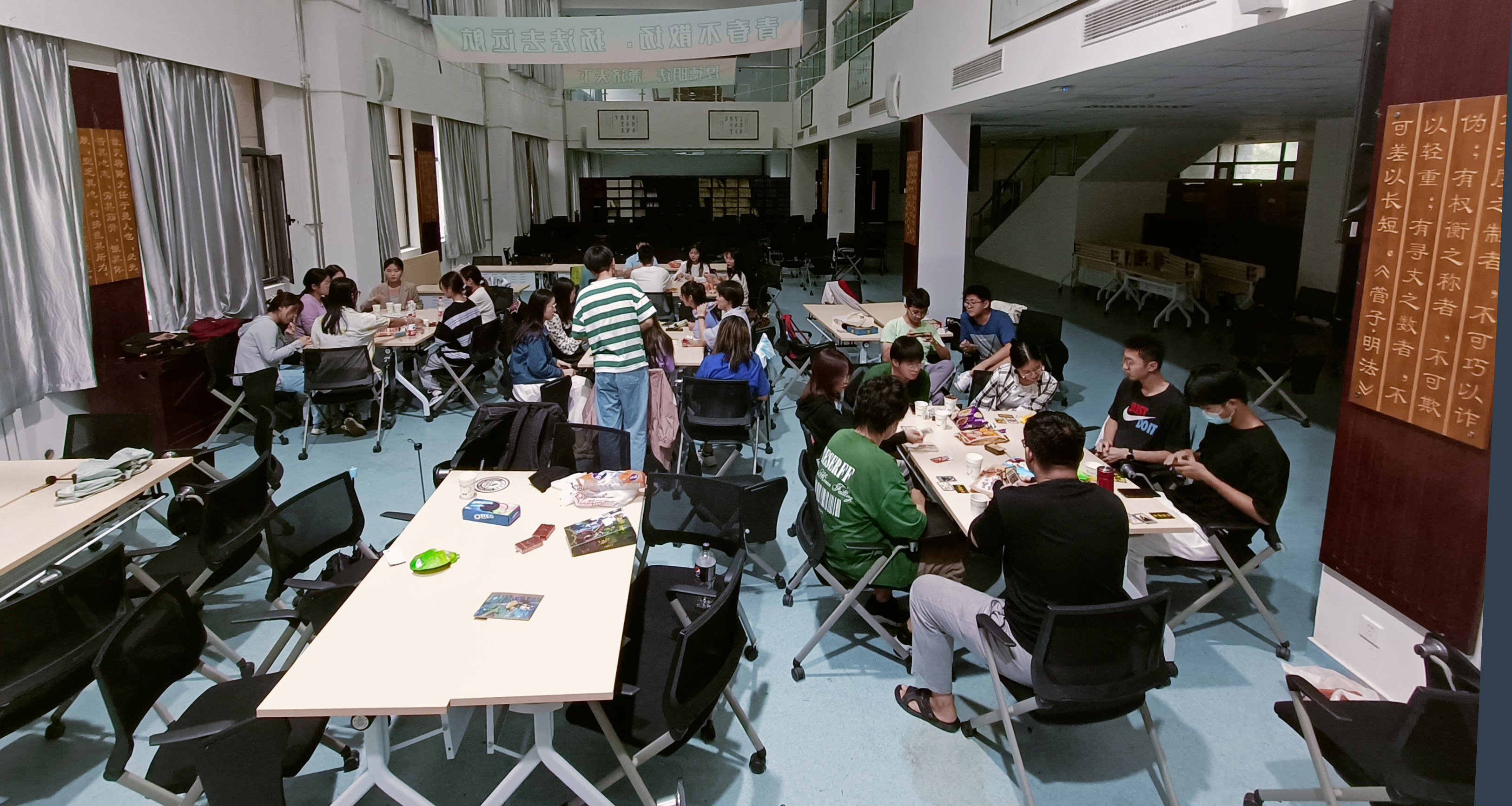 活动过程中,同学们根据自己的爱好,进行了桌游,纸牌,大冒险等形式多样,内容丰富的娱乐项目。大家利用游戏放松身心,缓解压力。还有一些同学趁本次活动的机会进行谈心交流,互相进行心理上的疏导。此外,活动负责同学还向大家提供了零食饮料等,使同学们乐在其中。除了线下的活动,一些喜欢电子竞技的同学还自发组织进行了线上的竞技比赛,整体氛围十分融洽。