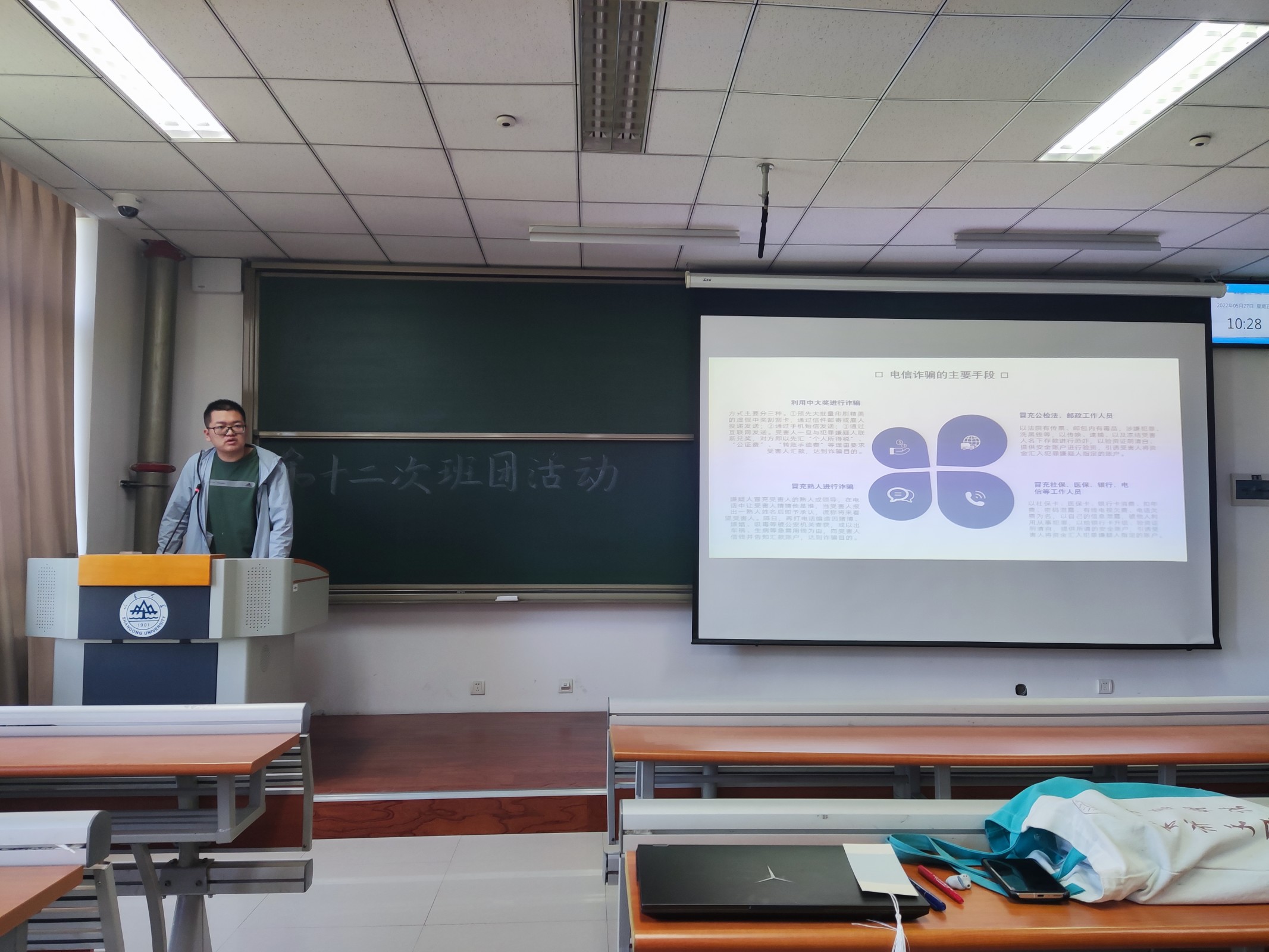 本次活动由法学1班副班长陈呈龙担任主讲人,以“远离电信诈骗、关注宿舍安全”为主题,他将理论知识和现实案例相结合,穿插讲解,整个过程生动有趣。