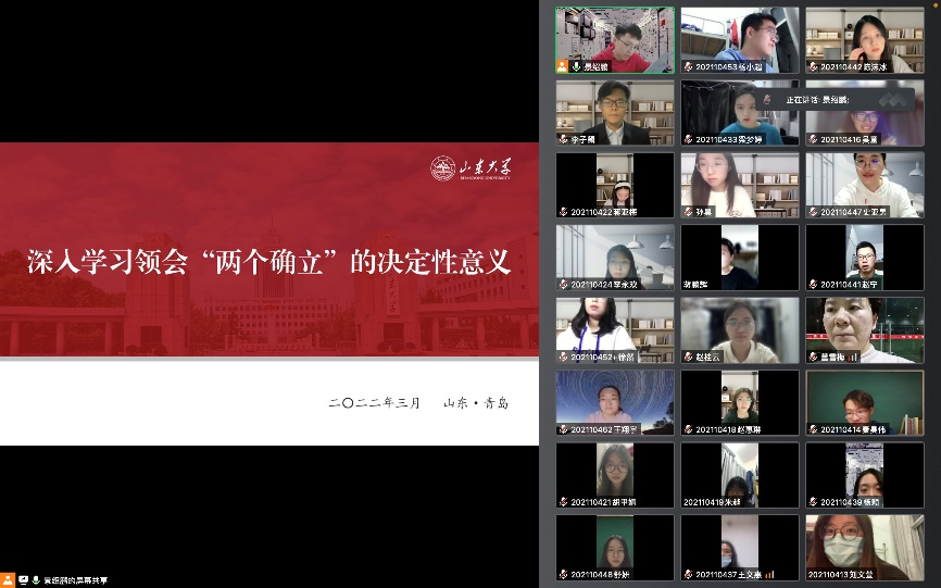 中国共产党第十九届中央委员会第六次全体会议公报指出,党确立习近平同志党中央的核心、全党的核心地位,确立习近平新时代中国特色社会主义思想的指导地位,反映了全党全军全国各族人民共同心愿,对新时代党和国家事业发展、对推进中华民族伟大复兴历史进程具有决定性意义。为深刻理解“两个确立”的依据与决定性意义,切实增强学生党员对“两个确立”的高度认同,3月29日,法学硕士第一党支部开展以“深入学习领会‘两个确立’的决定性意义”为主题的党课活动,本次活动于线上开展,支部全体党员、2021级法学硕士班入党积极分子、2019级本科学生党员参与活动,taptap点点体育党委副书记董雪梅到课指导。