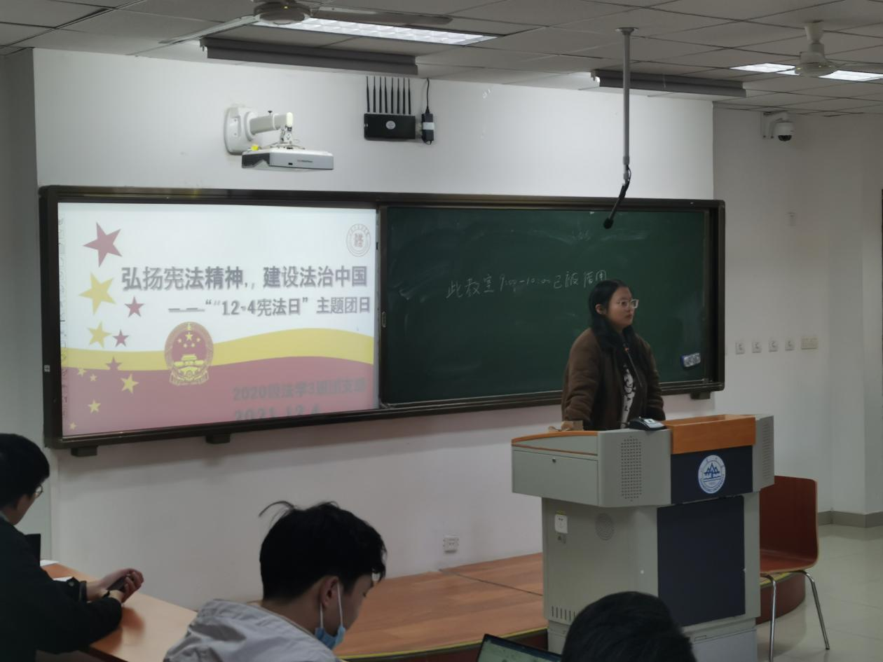 为深入学习习近平法治思想,全面贯彻落实党的十九届六中全会精神,多举措学习宪法知识,弘扬宪法精神,在第八个国家宪法日来临之际,2020级法学3班团支部于12月4日开展了以“弘扬宪法精神,建设法治中国”为主题的主题团日活动。