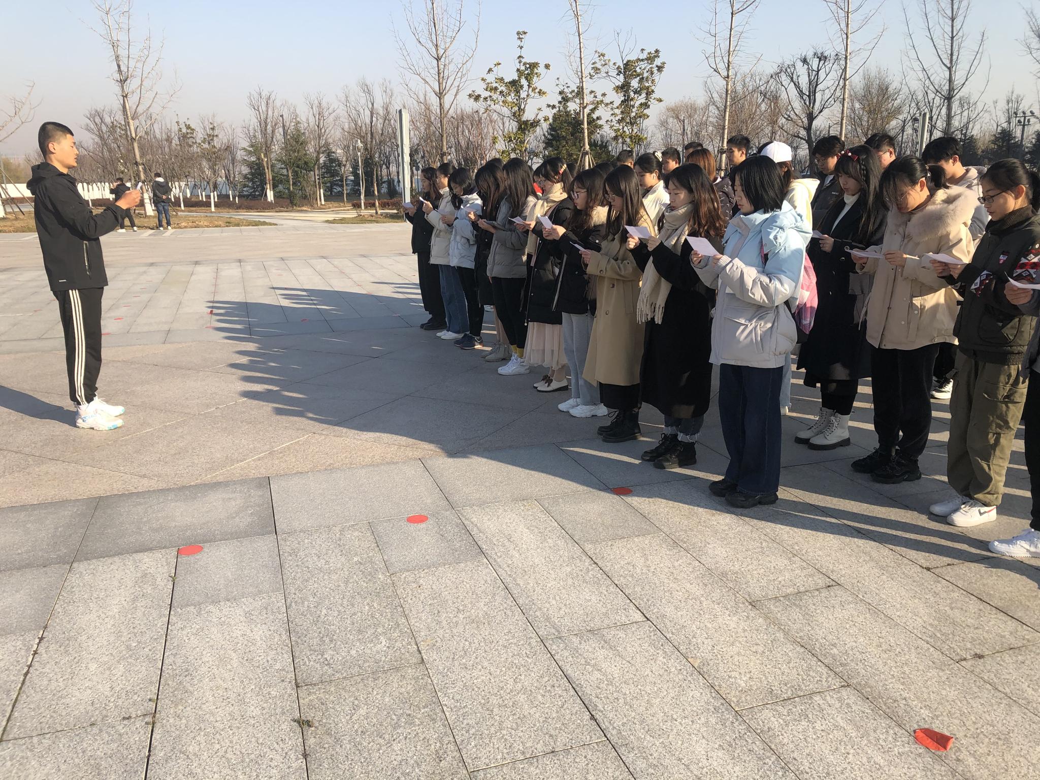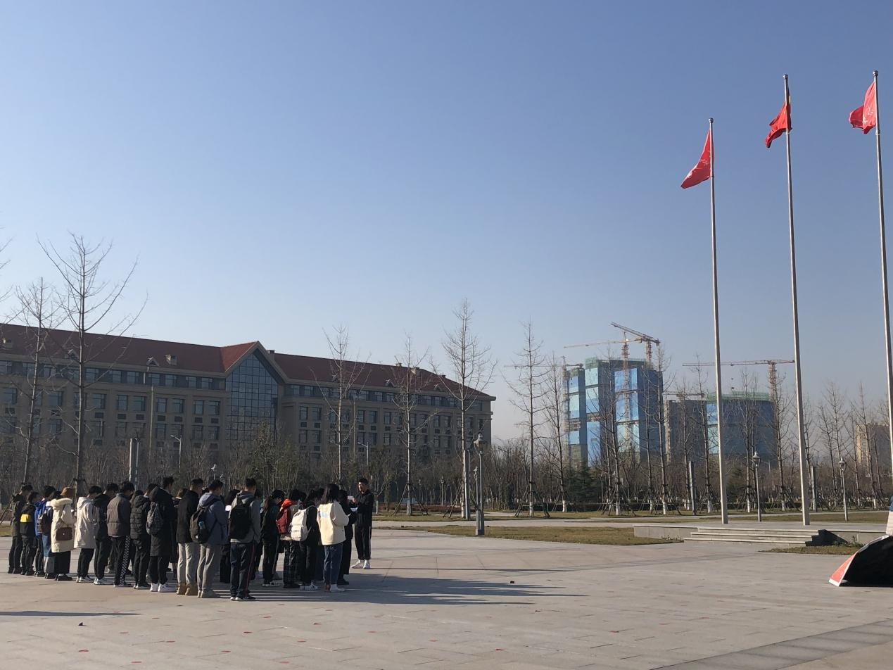 在观看结束之后,同学们相伴一起来到了育贤广场的国旗下,伴随着微微清风,以罗智晋同学领读,同学们跟读的形式,我们一起朗读了宪法条文。国旗在风中飘扬,微醺的阳光照在同学们的脸颊,目光坚毅,诵读声朗朗。
