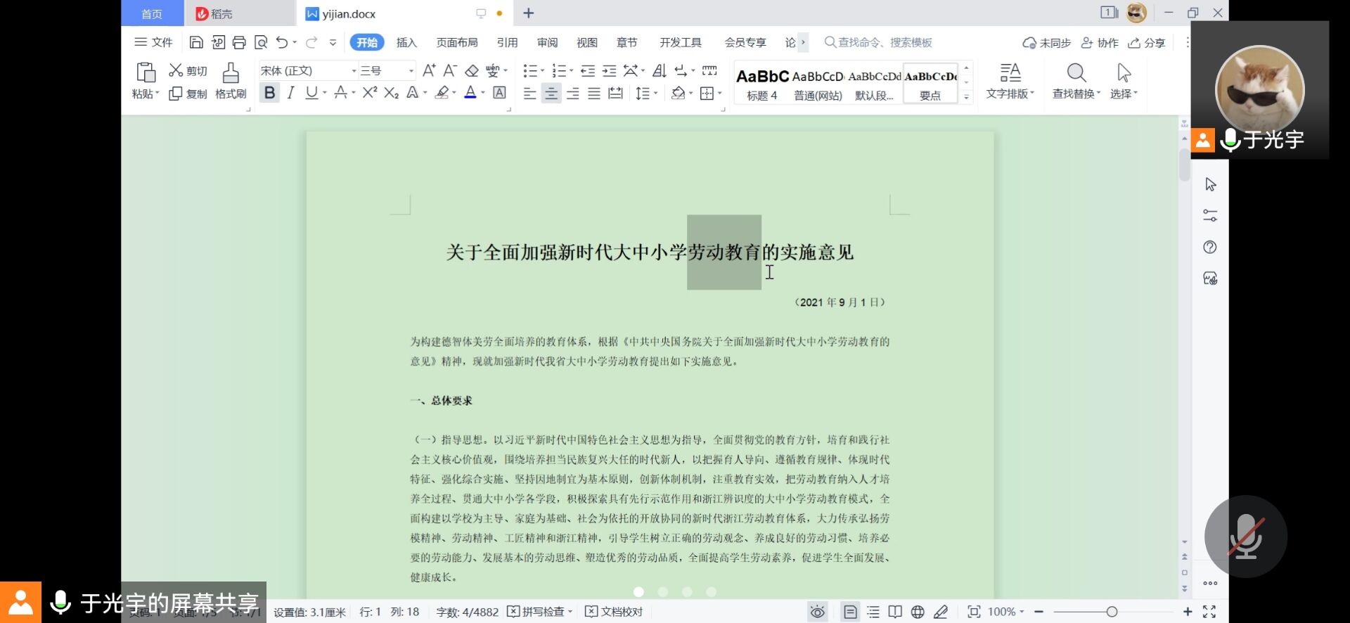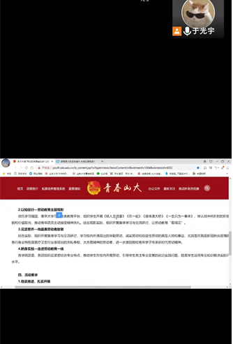 做好劳动教育,首先要做到对文件核心精神能够深刻理解和贯彻落实。团支书于光宇同学基于《关于全面加强新时代大中小学劳动教育的实施意见》(以下简称《意见》)以线上会议的形式向全体团员深入浅出地阐述了新时代劳动教育的核心精神与内容要旨,并结合《中共taptap点点体育委员会关于全面加强新时代学生劳动教育的行动方案》等本校文件,对未来劳动实践进行指导和规划。在会议中,各位同学就自己对于《意见》精神内涵的理解各抒己见,全面体现了各位同学对于劳动教育重要性的认识与看法。