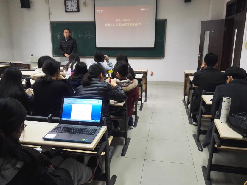 下午三时许,同学们带着饱满的热情陆续来到301教室等待活动的开始。三时半,活动正式开始,首先由刘显楷同学进行此次活动举行的说明,他提到:“红军长征精神作为一种时代精神,值得我们重温回味,更值得我们从中不断学习,提炼出当代大学生应当具备的品质。”紧接着,在诗句“红军不怕远征难,万水千山只等闲。五岭逶迤腾细浪,乌蒙磅礴走泥丸······”的诵读当中开始了此次活动的主要内容——观看记录片《长征》。同学们严肃认真地观看纪录片,时而沉思,时而欣喜,每个人都随着纪录片中长征的历程而思绪起伏万千。长征路上的苦难与艰辛都牵动着同学们的情绪。在一个小时的纪录片结束之际,同学们仍意犹未尽。
