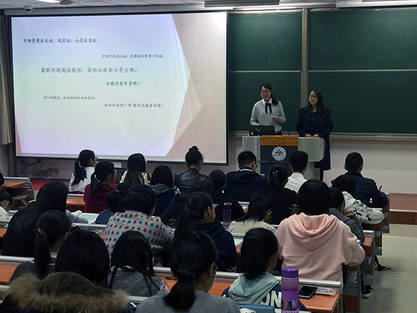 随后,2017级全体同学以班级为单位围绕《习近平的七年知青岁月》一书进行小组展示,可以看出,同学们前期做了充分的准备,在交流会上积极参与,现场气氛活跃。慷慨激昂的演讲、声情并茂的朗诵、高亢嘹亮的歌声,无一不显现出同学们对习近平总书记青年时代艰苦奋斗精神、高尚品格的学习领悟成果,对党和国家的热爱,以及为实现中华民族伟大复兴中国梦的坚定信念。同时,同学们创造性地编排情景剧,还原习近平总书记在梁家河工作的场景,来表现对习近平总书记扎根人民、实事求是的工作态度的认同。
