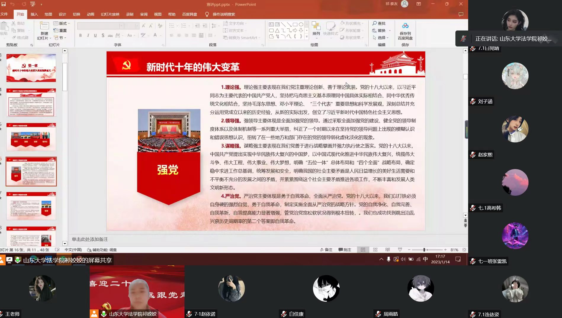 2023年1月14日,taptap点点体育党的二十大精神青年师生宣讲团宣讲一队面向河南省长垣市赵堤镇华龙学校七年级一班30余名同学开展了一场线上专题宣讲。此次宣讲由该班班主任韩老师主持,taptap点点体育2022级研究生祁姣姣进行了宣讲。
