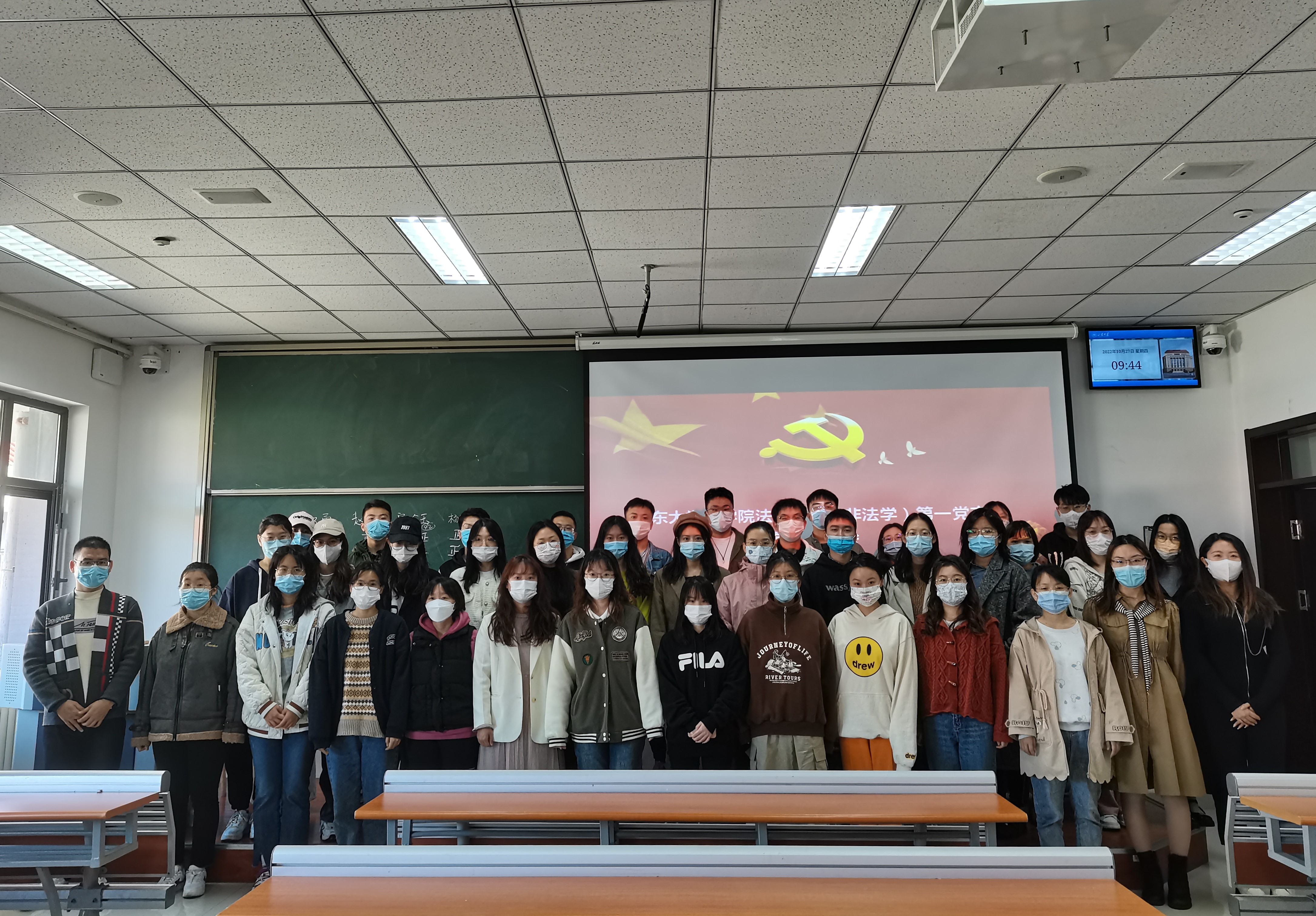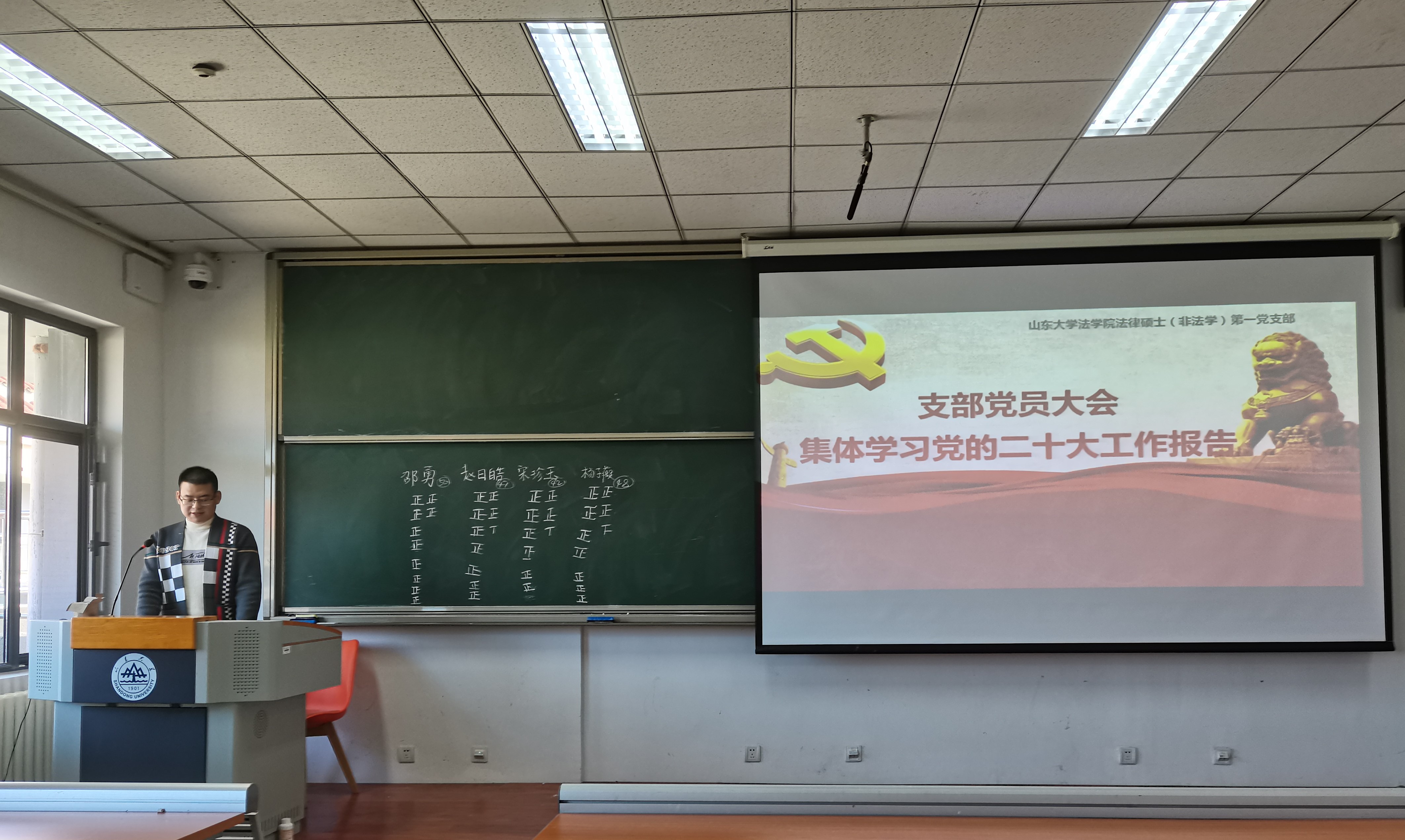 10月27日上午,taptap点点体育2021级法律硕士(非法学)第一党支部在振声苑S402开展“喜迎二十大,奋进新征程”主题党日活动暨换届大会,taptap点点体育党委副书记邹永厚列席此次会议。会议换届选举由赵日皓同志主持,主题党日活动由邵勇同志主持,支部全体党员参加。
